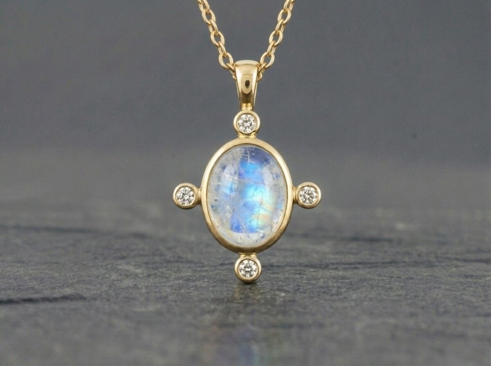 Vedhæng håndlavet i 18 karat guld med den smukkeste changerende regnbue månesten og 4 små diamanter, i alt 0,04 carat Top Wesselton VVS.