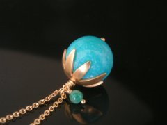 Lang halskæde i forgyldt sølv med blomst der griber omkring en blå jade sten.