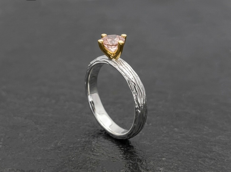 Gren fingerring i sterling sølv med grabbefatning i 18 karat guld isat en snuk rosa morganit. Kan laves både med og uden oxydering.